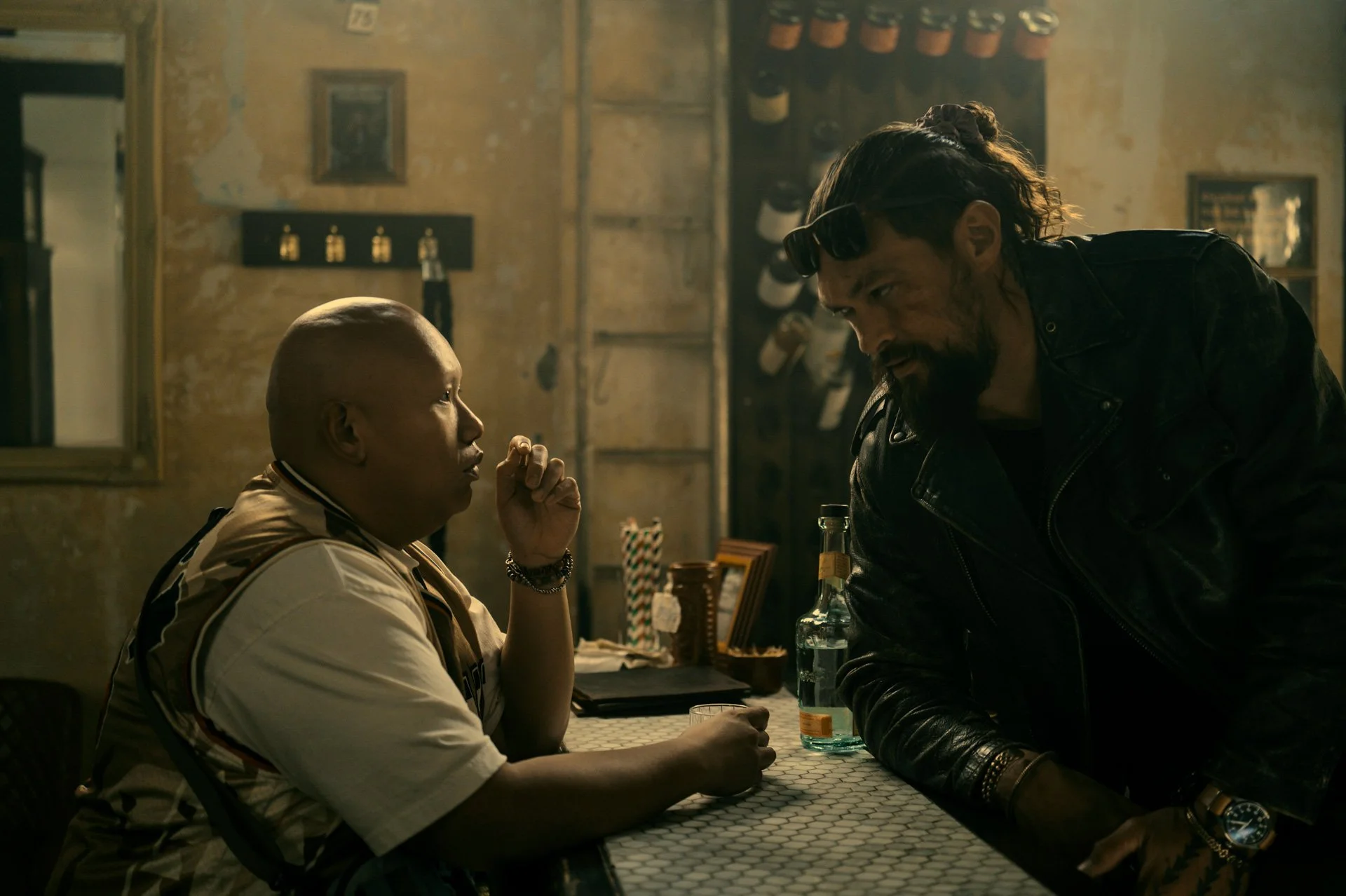 After a mildly exciting close quarters brawl in Momoa’s apartment, Angel Manuel Soto totally loses the plot on his action sequences. Most of the more extravagant scenes are draped in painfully cheap streaming movie CGI that removes any sense of danger. At one point, two cars are corkscrewing each other while Momoa and his aggressor shoot at each other, but it’s so plain to see that both men are leaning out of the car against a green screen, trying very hard to look cool. Even worse is the pre-climax car chase where motorcycle gangsters climb into their van and they proceed to have the exact same backseat brawl that Deadpool opened with while barely rendered car crashes and explosions go off in the background. The more physical ones are derivative. The apartment fight is a wannabe Indonesian action. Dave Bautista takes on some goons in an Oldboy style wide. The brothers have a lengthy fistfight in the rain pulled straight out of They Live. Unoriginal and poorly executed.
